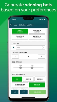 You choose the leagues you want to bet on, the type of event (1X2, double chance, under/over , combo and both team to score), the desired odds range, the number of matches and BetMines will generate for you the most likely bet based on the criteria you have chosen.