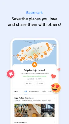 Easily save your best restaurants and must-visit tourist spots on NAVER Map and share them with others.